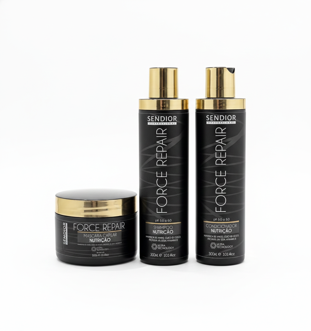 Kit Nutrição Force Repair Completo Sendior oferece uma solução eficaz para cabelos danificados, promovendo nutrição profunda e recuperação dos fios. Inclui shampoo, condicionador e máscara capilar, formulados para fortalecer cabelos fragilizados e devolver brilho saudável. Ideal para uso diário, o shampoo de 300ml limpa suavemente enquanto nutre, o condicionador de 300ml desembaraça e hidrata, e a máscara capilar de 300g proporciona reparação intensiva. Produto com pH adequado para preservar a saúde dos fios, enriquecido com ingredientes que reforçam a estrutura capilar e auxiliam na renovação do cabelo. Uma escolha técnica para quem busca resultado profissional em casa, com tratamento completo para cabelos opacos e sem vida.